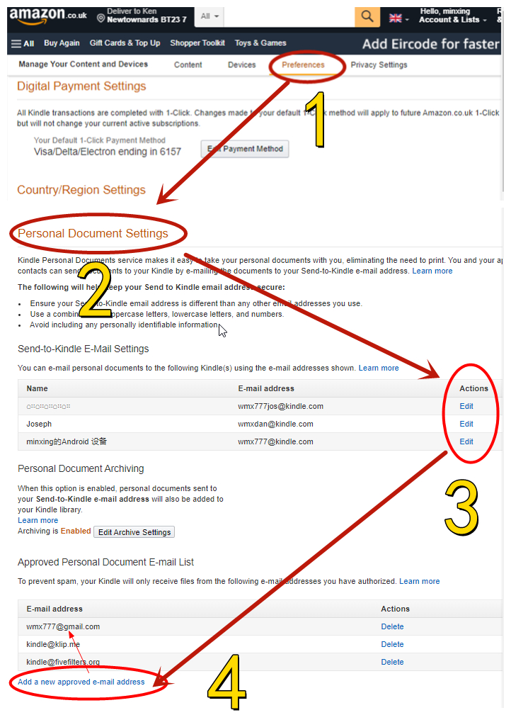 3的地方点击 Edit。(随意输入你要的名字,这个就是以后传书的邮箱地址,以后有什么书,从你的邮箱发到这个邮箱地址,就会自动传到 相关 kindle 设备的首页。)